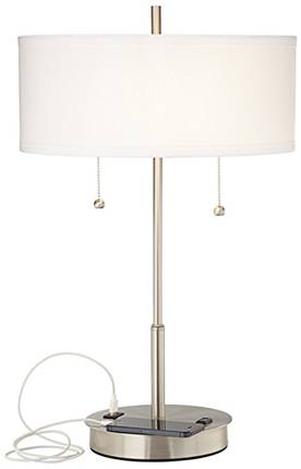 Elevate your hotel room, bedroom, or office space with the Brushed Nickel Hotel Bedside Table Lamp HLHT7029. Featuring a sleek metal body with a brushed nickel finish and an off-white linen drum shade, this lamp blends modern elegance with practical functionality. Equipped with dual E26/E27 sockets, a built-in 2.0-A USB port, and a convenient power outlet, it allows you to illuminate your space while charging devices. Twin on/off light pulls make operation simple, and the 8’ clear silver SVT cord provides flexible placement. Perfect for hotels, bedrooms, and contemporary interiors seeking style and utility.