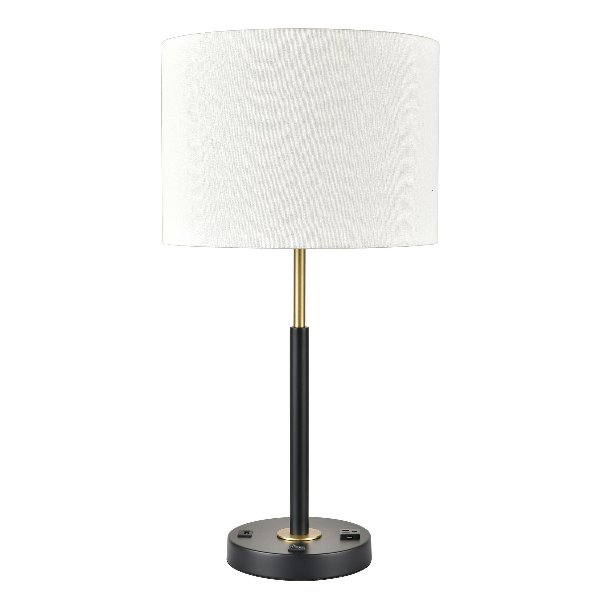 Plated Brushed Brass Table Lamp with Matte Black Base and White Fabric Shade – 60W E26 with USB & Outlet